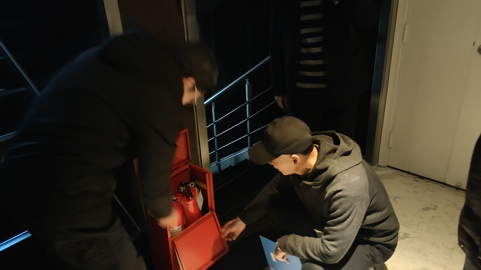 随后检查组抽查了酒店五楼的灭火器、室内消火栓是否完好。疏散通道内应急照明和疏散指示标志是否正常工作。模拟了酒店客人从五楼通过疏散楼梯到达一楼室外。检查了酒店一楼沿街商铺的消防器材配备和疏散通道情况。