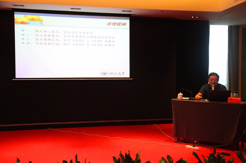 2017年9月21日下午,为深入学习习近平总书记系列重要讲话精神和治国理政新理念新思想新战略,准确把握其精神实质和丰富内涵,切实做到思想和行动与党中央保持高度一致,牢固树立政治意识、大局意识、核心意识、看齐意识,不断提高运用理论指导实践的能力,集团公司特邀请浙江大学马克思主义学院教授、浙江大学当代中国政治研究所所长、浙江省高校习近平同志系列讲话精神宣讲团成员段治文在浙江饭店名人厅为集团领导干部作题为《踏上全面从严治党新征程——习近平总书记系列重要讲话精神》的报告,集团公司党委委员、全体中层干部、本部全体员工、各下属企业党组织主要负责人、党支部书记参加了本次学习。